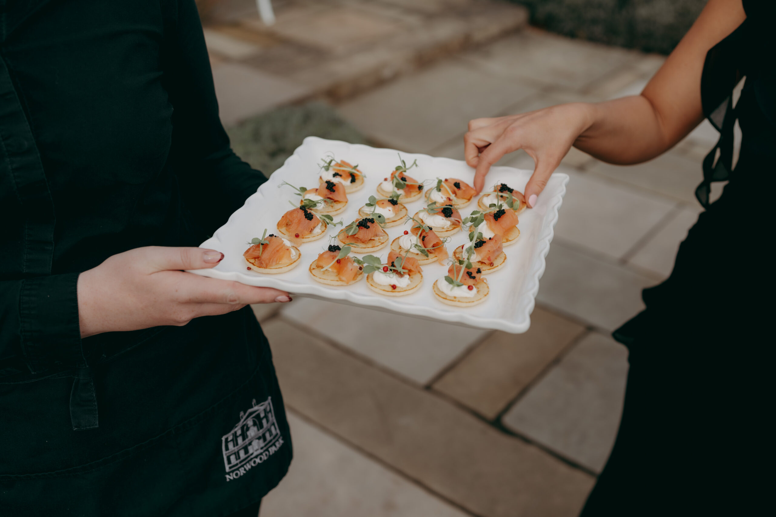 Start your food journey with an elegant amuse-bouche at cocktail hour while your guests mingle and soak in the atmosphere of your big day. Our team will circle the room with an array of delicious hors d'oeuvres to tide you over before the main event, the Wedding Breakfast.